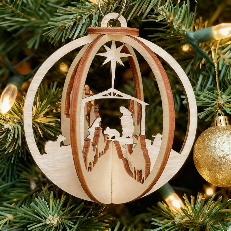 You won't believe the coolness factor – it's laser-cut wood that comes in three pieces, each fitting together like a holiday puzzle. Imagine the joy as you assemble your very own 3x3-inch Nativity scene, bringing that festive spirit right into your space.And wait, it gets even better! This ornament isn't just for your tree – it's the perfect decoration to sprinkle some holiday vibes all around your place.